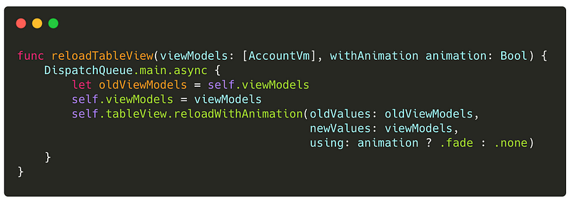 We’ll then need to implement the reloadTableView(..) function. This takes a snapshot of the current view models, updates it to be the new view models, and calls a function that we add via an extension on the UITableView.