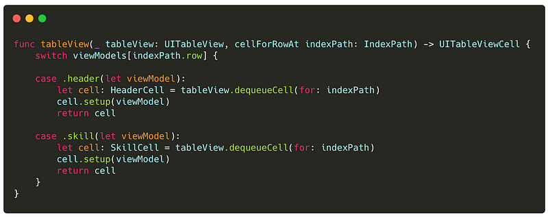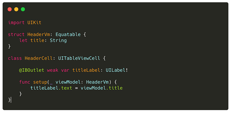 Each UITableViewCell has its own Equatable view model that’s passed to it on setup. Here’s a simple example for a header cell that takes in a label containing a title and sets it on the cell.Helpful tip: The view model's equatable function doesn't need to be implemented if all the properties in the struct are Equatable.