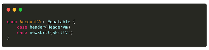 In this example, I have two cells I want to display. Therefore, I use two enums to represent each cell. The associated value contains the equatable view model.