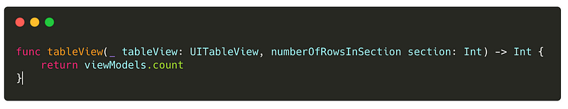 For the number of rows in the section, we can simply return the number of view models in the array.