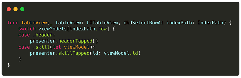 As for handling tap events, we can easily switch based on the selected IndexPath to determine the corresponding view model.