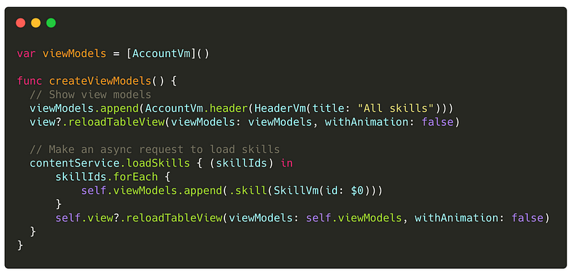 We can then create our view models either from our controller if we’re using MVC, or a presenter if we’re using MVP. Obviously, this will vary based on the architecture of your app. In our case, we’re calling a function on our UIViewController from our presenter to provide it the data once it’s loaded.